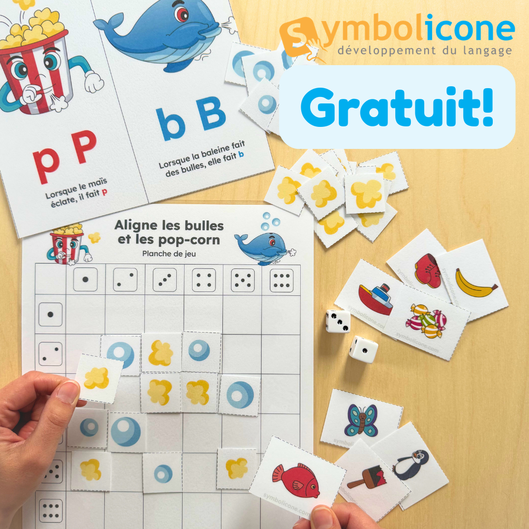 Aligne les bulles et les pop-corn est un jeu imprimable qui aide les enfants à différencier les sons /p/ et /b/, tout en s’amusant. À l’aide d’images simples et d’un jeu de type « puissance 4 », l’enfant nomme, écoute et identifie le son initial des mots pour placer ses pions et tenter de créer un alignement.