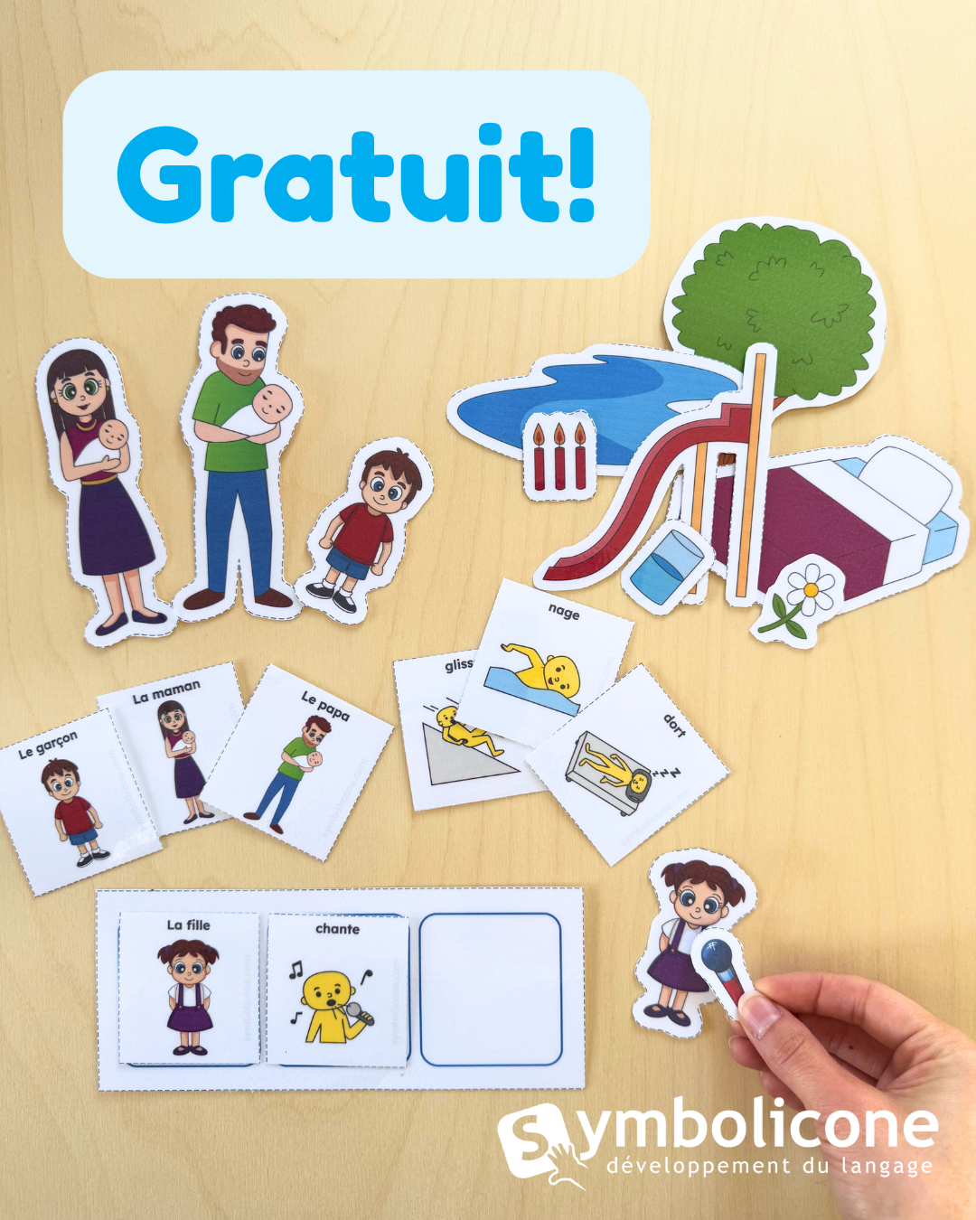 Jouons avec les actions est une activité imprimable qui aide les enfants à construire des phrases simples tout en s’amusant. À l’aide de pictogrammes (sujets et actions), d’une bande-phrase et de marionnettes, l’enfant crée, dit et met en scène des phrases de 2 à 3 mots.